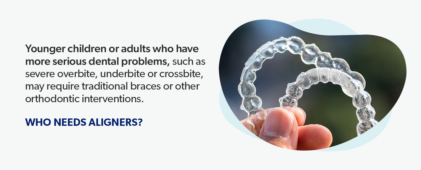 Like metal braces, aligners can be used to correct minor spacing issues with teeth, overcrowding or minor over- and underbites. To work most effectively, they need to fit snugly around teeth, which means teens and adults — whose teeth are already in place — are the best candidates for aligners. Younger children or adults who have more serious dental problems, such as severe overbite, underbite or crossbite, may require traditional braces or other orthodontic interventions.